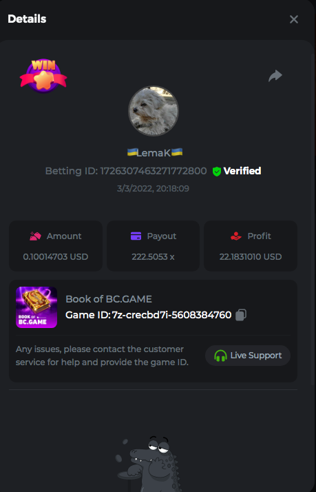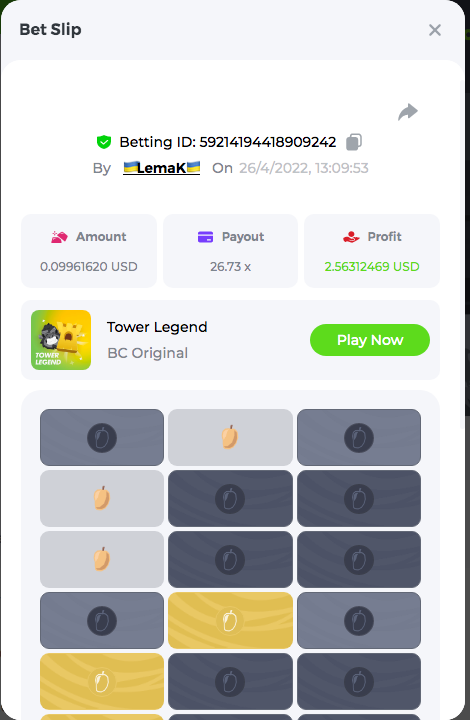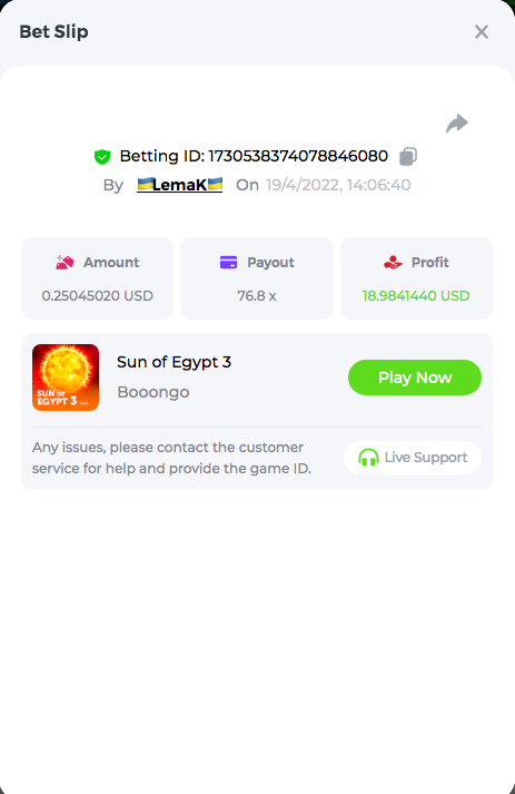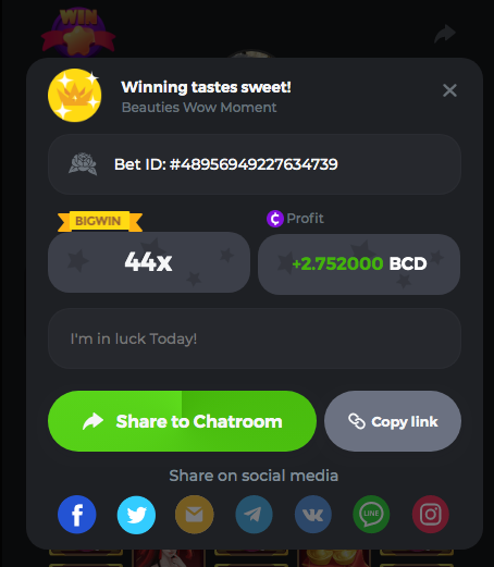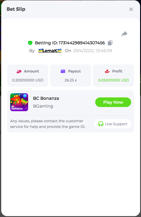 Easy Follow BCGame on Instagram (screenshot & IG username required). Post a photo or video on Instagram and tag BC.Game official profile (link to post & IG username required). Follow BCGame on Twitter (screenshot & twitter handle required). Like & Retweet the latest BC.Game Twitter post, tag at least 3 friends (link to post & twitter handle required). Follow BCGame on Facebook (screenshot & FB username required). Win a bet in Cave of Plunder on 7.50x payout (Completing all book symbols). Win a Sports bet with minimum odds being 1.3x (singles only) 1$ base min amount. Get a minimum 20x multi on Amatic Lady Fruits 100 Easter slot. Get a minimum 30x multi on Gamomat Ramses Book Easter Egg slot. Enable 2FA for your BC.Game account (If it's already activated, keep it activated during event week). 6- Betting ID: 29437972134757911 7,5X https://bc.game/sd/?sd=10IASKLP66OA37 10- Medium Get a minimum 10x multi on Play&Go Easter Eggs slot . Win a bet in Roulette Single with betting on 0 only (36x). Get a 76x on Plinko. Get a minimum 60x multi on Wazdan Power of Gods™: Medusa Easter slot. Win a Sports bet with minimum odds of 2x (singles only) 1$ base min amount. Win a bet with Straight Flush in Video Poker (60x). Win a bet on Keno Single by selecting numbers 7, 30, and 8, Medium risk. (49.50x). Get a minimum 90x multi on Big Time Gaming White Rabbit slot. Win a bet by getting a natural Blackjack (A+K/Q/J/10) with only red cards in it. Get a minimum 100x multi on No Limit City Bonus Bunnies slot. 2-Betting ID: 49544011127455779 36X https://bc.game/sd/?sd=10IASSDKQV6VWZ 3- Betting ID: 58904986838372342 https://bc.game/sd/?sd=10IDAWFW4V69ZN 6. Betting ID: 60139442043617979 https://bc.game/sd/?sd=10IGN5SIO4Y977 7- Betting ID: 60185479798063607 https://bc.game/sd/?sd=10IDA1L5IFAJV7 Hard Get a 49.50x on Wheel (50 segments, High risk). Get a 420x on Plinko (14 rows, High risk). Win with a minimum 500x multi on Limbo. Get at least 300x multi on BGaming Hello Easter slot. Win with a minimum 999x on Crash. Get a minimum 100x multi on Pragmatic Chicken Drop slot. Get a minimum 100x multi on Push Gaming Fat Rabbit slot. Post a winning bet with 21 mines and 3 diamonds on Mines game, (569.25x). Win a bet on Keno Single by selecting numbers 10, 11, 12 and 13, High risk, (259.00x). Win a Sports bet with minimum odds of 10x (any bet allowed) 1$ base min amount. 1- Betting ID: 54674624440434790 https://bc.game/sd/?sd=10IAMWL9R3JKLV 9- Betting ID: 60041787372208421 https://bc.game/sd/?sd=10IAMIBHT00VF7